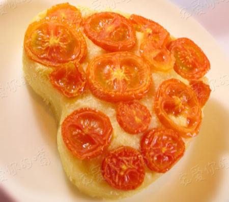 5.樱桃番茄切成小圈,摆在面糊上。